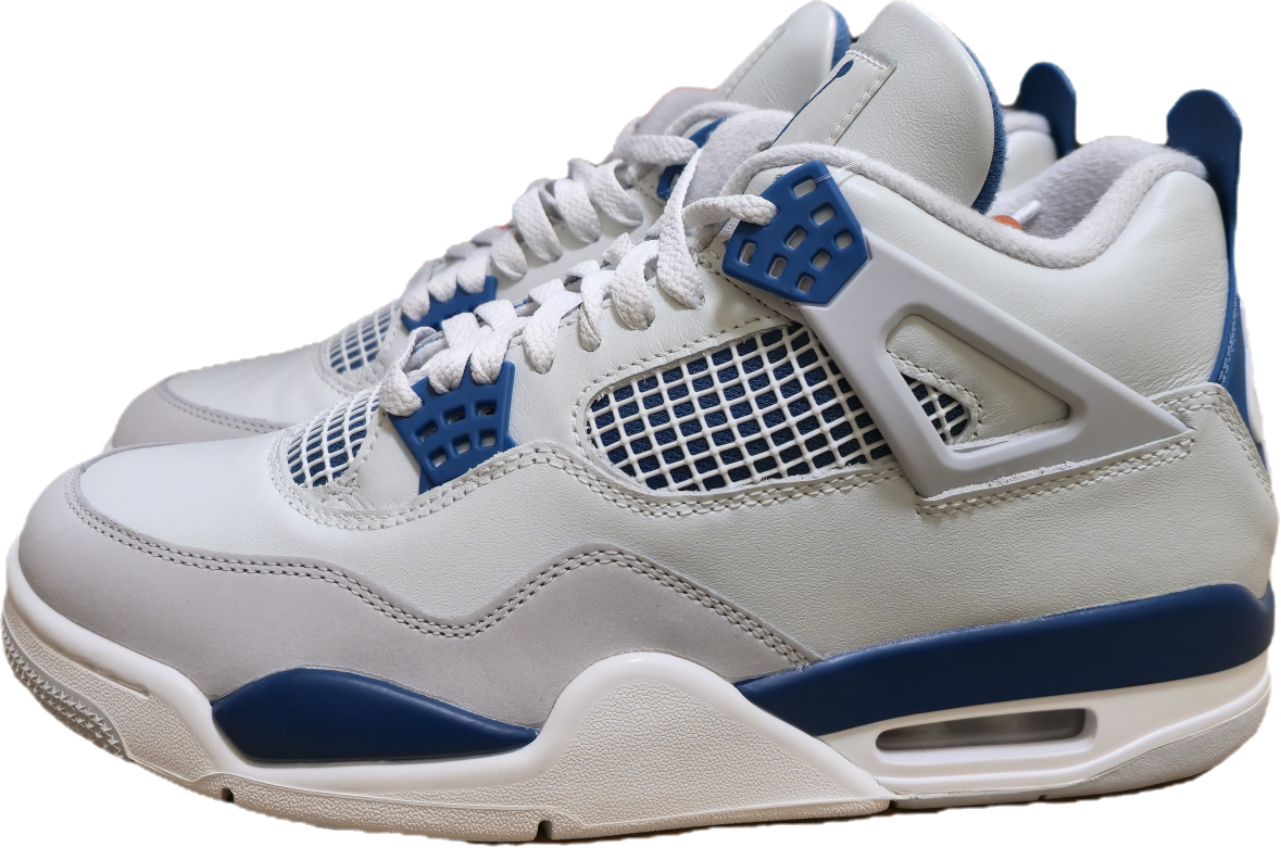 A cipő felsőrésze prémium fehér bőrből készült, amelyet szürke és élénk kék (military blue) részletek egészítenek ki. Az ikonikus TPU hálós betétek, a fűzőfülek és a sarokpanelek adják a Jordan 4 egyedi karakterét. A színkombináció letisztult, mégis erőteljes, így könnyen kombinálható hétköznapi és sportos outfitekkel is.